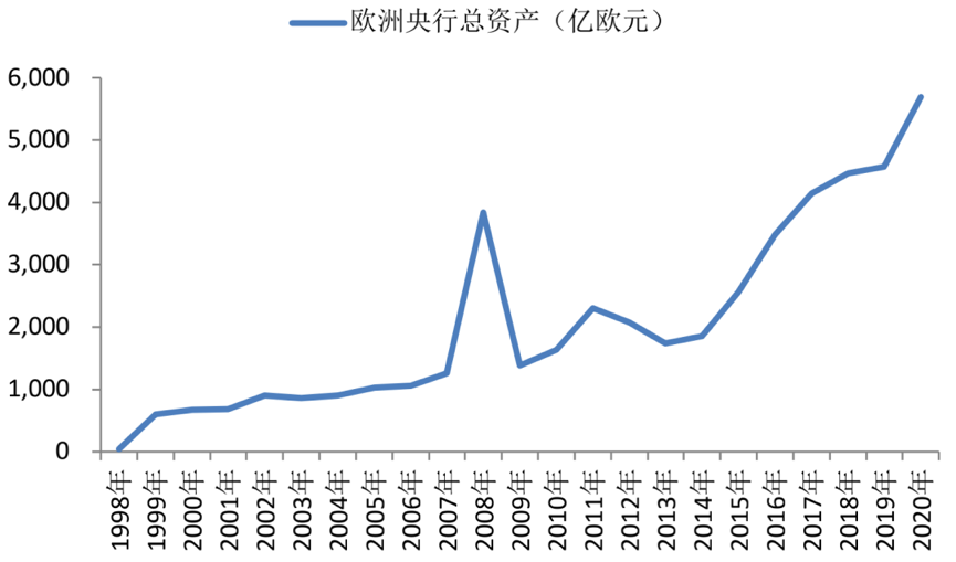 图表4显示欧洲央行和美联储一样实行了0利率的政策,图表5显示欧洲央行同样使用了量化宽松的政策,虽然其总规模远小于美联储,但其资产负债表也扩大了数倍之多。