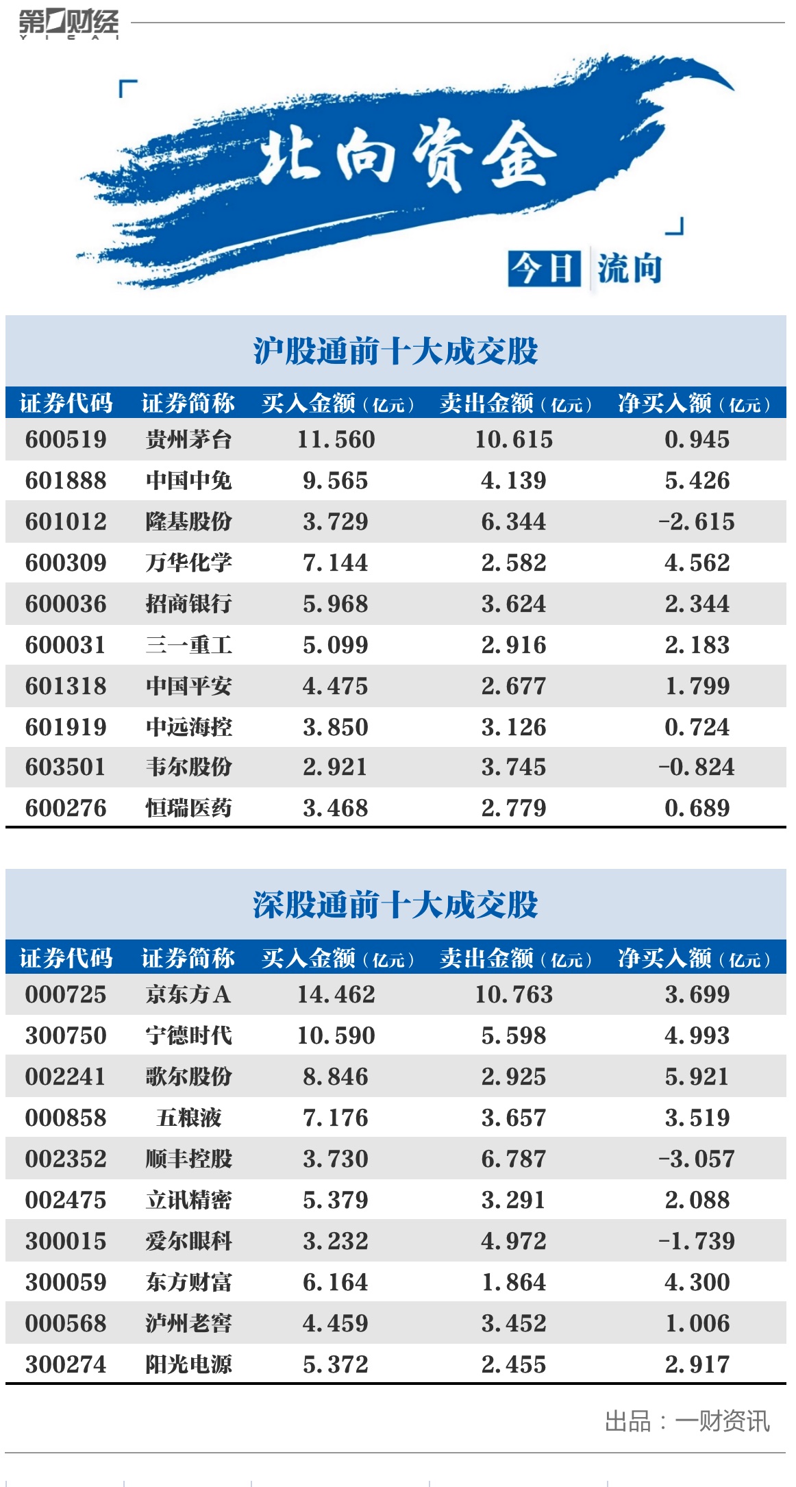 前十大成交股中,净买入额居前三的是歌尔股份、中国中免、宁德时代,分别获北向资金净买入5.92亿元、5.43亿元、4.99亿元。