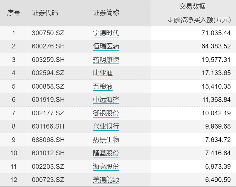 据wind统计显示,4月14日共有982只个股获融资净买入,净买入金额在千万元以上的有165只,其中7只融资净买入额超1亿元。宁德时代获融资净买入额居首,当日净买入7.1亿元;恒瑞医药、药明康德、比亚迪分别获净买入6.44亿元、1.96亿元和1.71亿元;净卖出方面,京东方A、中国中免、东方财富分别遭净卖出3.09亿元、3.08亿元、1.39亿元。