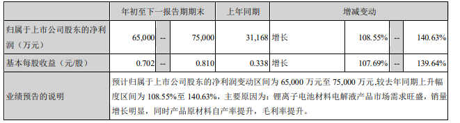 此外,公司预计上半年归母净利润变动区间为6.50亿元至7.50亿元,较去年同期上升幅度区间为108.55%至140.63%。主要原因为,锂离子电池材料电解液产品市场需求旺盛,销量增长明显,同时产品原材料自产率提升,毛利率提升。
