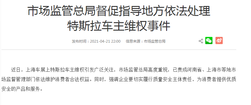 市场监管总局督促指导地方依法处理特斯拉车主维权事件