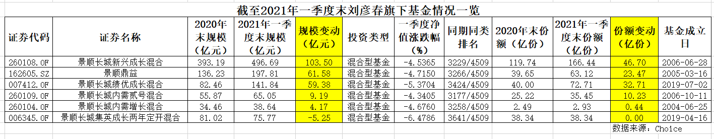 截至2021年一季度末,刘彦春所管基金规模突破千亿元,为1015.8亿元,继易方达张坤之后,成为又一位“千亿公募基金经理”。具体来看,刘彦春目前共管理6只基金,分别为景顺长城新兴成长混合、景顺鼎益、景顺长城绩优成长混合、景顺长城内需贰号混合、景顺长城内需增长混合、景顺长城集英成长两年定开混合,其中,景顺长城新兴成长混合规模最大,为496.69亿元,较2020年末的393.19亿元增加103.50亿元,份额为166.44亿份,较119.74亿份增长46.70亿份;景顺长城鼎益规模达197.81亿元,距离200亿规模也仅一步之遥。