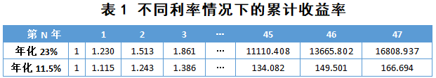 我们可以进行一个简单的测算,在不融资的情况下,年化收益率为11.5%,47年后,累计收益率将达到167倍。如果以1:1比例进行融资,年化收益率则翻倍到23%(不考虑融资成本的情况下),47年后累计收益率将达到近17000倍!也就是说,1倍的融资杠杆,在47年间的复利作用下,将累计收益率提升了100多倍。