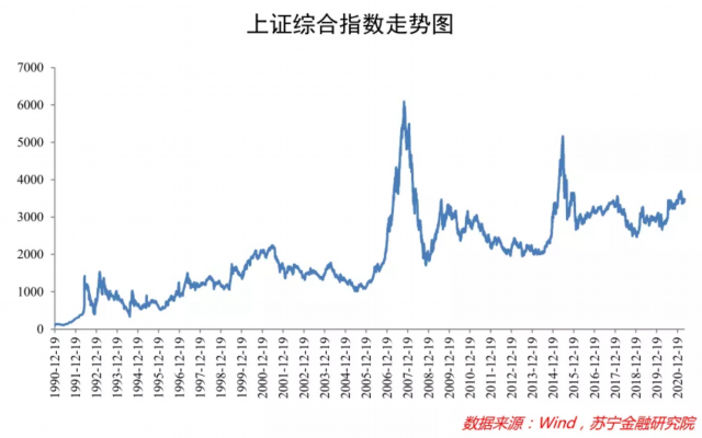 相比之下,我国的A股市场几乎从来没有表现出长牛的特征,即便出现过两次大牛市,其高点也是越来越低,2007年牛市高点为6124点,2015年则为5178点。近两年,上证指数始终在2500~3500点区间徘徊,与10年前相差无几,而且也并没有出现牛市到来的征兆(见下图)。考虑到我国经济过去20多年的飞速增长,上证指数的走势显然不能很好地反映出国民经济的发展成果。