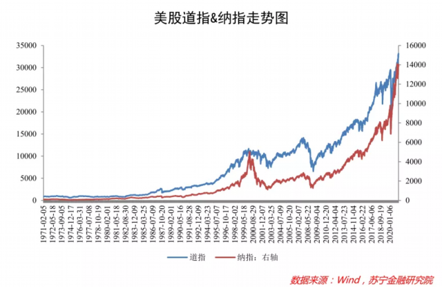 此言似乎有一定道理。纵观历史数据,除了个别年份的股灾之外,美国股市指数整体上展现出良好的稳步上涨态势;其中,2008年金融危机过后至今,道琼斯工业指数从8000多点涨到34000点,涨幅高达300%,纳斯达克指数也从1500多点涨至14000多点,涨幅超过800%(见下图)。