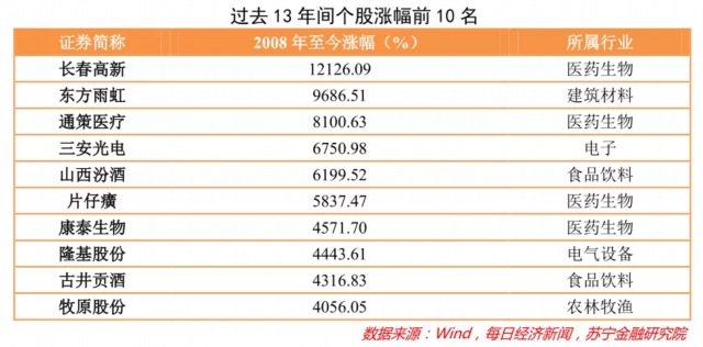 不仅如此,那些消费升级概念下崛起的优质白马龙头股,近些年业绩和涨势也是非常可观。如果从13年前,本文开篇那位大妈买入股票的时间算起,我们会发现有很多个股都展现出极其强大的增长势头。例如,13年间长春高新和东方雨虹分别涨了121倍和96.8倍,通策医疗、三安光电、山西汾酒、片仔癀、隆基股份等也都涨了40~80倍不等,这些个股都是非常好的价值投资标的——而那位大妈买入的,正是涨幅排名第一的长春高新。