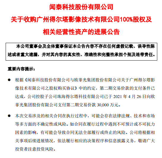 关于此次收购进展,闻泰科技在公告中披露,第二期交易价款的支付条件已达成,公司控股子公司珠海得尔塔科技有限公司已于4月26日向欧菲光集团股份有限公司支付第二期交易价款3亿元。