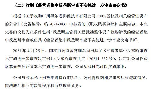 4月26日,闻泰科技发布公告称,4月25日,国家市场监督管理总局出具了《经营者集中反垄断审查不实施进一步审查决定书》,决定对公司收购欧菲光部分业务案不实施进一步审查,公司从即日起可以实施集中。