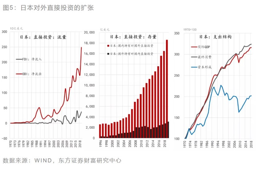 1990年,日本房地产泡沫崩溃时,恰逢人口红利的拐点。在国内“资产负债表衰退”和劳动力短缺的情况下,再叠加1970年以来日元的大幅升值和1980年开启的金融自由化,日本大幅增加了对外直接投资(图5)。