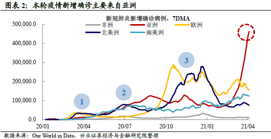继欧美后,亚洲成为新的疫情“震中”。分洲来看,继第一波(2020年3月海外)、第二波(2020年6月美国)、第三波(2020年10月~2021年1月美国欧洲)之后,本轮疫情的新增确诊主要来自亚洲。