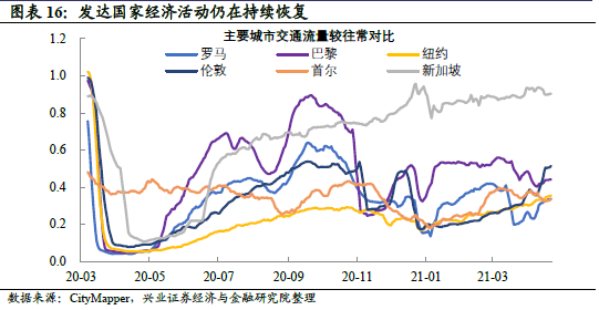 从2020年的经验来看,发达国家经济活动的恢复为全球提供了需求来源,新兴市场活动往往与发达国家的需求更为相关。当前,发达国家经济活动持续恢复,并未受印度等新兴市场疫情反复的明显影响。