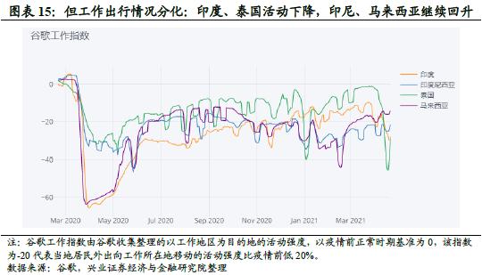 在经历了2020年经验后,新兴市场国家谨慎使用经济停摆对抗疫情。但其工作出行强度表现分化,印尼和马来西亚等国工作强度并未下降,印度经济活动明显回落但与2020年第三季度相当,泰国活动明显下降或与游行等因素相关,并非疫情所致。