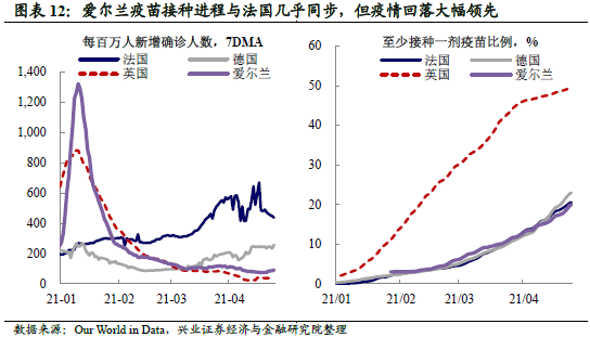 严格的防控是爱尔兰疫情好转的重要原因。虽然欧洲整体防疫政策在疫情反弹后有所加强,但从谷歌高频活动数据来看,英国、爱尔兰和德国的限制政策较法国明显更为严格,2021年初以来经济活动降低得更多。