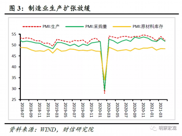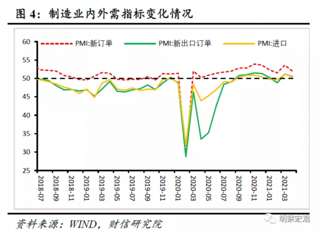 从供给指标看,制造业生产扩张放缓。4月生产指数为52.2%,较上月下降1.7个百分点,制造业生产扩张放缓(见图3),主要原因在于成本提高下企业利润受到挤压,制造业企业开工能力和意愿均出现回落。