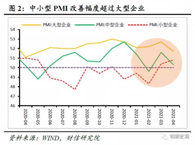 服务业修复带动小型企业景气度回升。4月份大型、中型企业PMI分别录得51.7%和50.3%,低于上月1.0和1.3个百分点,但小型企业PMI录得50.8%,高于上月0.4个百分点,小型企业景气度提升明显(见图2),主要原因在于前期受疫情冲击较大的服务业修复加快,对小型企业生产经营活动形成支撑。