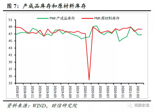 从库存指标看,企业步入主动补库存周期。4月份原材料库存和产成品库存指数分别为48.3%和46.8%,分别较上月下降0.1和提高0.1个百分点(见图7)。企业原材料库存提高、产成品库存下降的趋势未变,制造业企业进入主动补库存周期:一是随着国内外需求恢复预期增强和国际大宗商品价格普遍上涨,企业囤购原材料意愿增强;二是国内外需求共振复苏下,企业产成品销售加快,产成品库存出现下降。