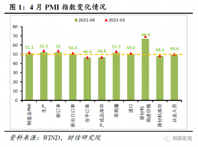海外供给修复下出口需求边际回落,加之大宗商品涨价、国际运费上涨、汇率高位运行等因素导致企业成本上升,4月制造业PMI较上月回落0.8个百分点至51.1%(见图1),但连续14个月高于临界值,制造业扩张势头未变,但步伐有所放缓。