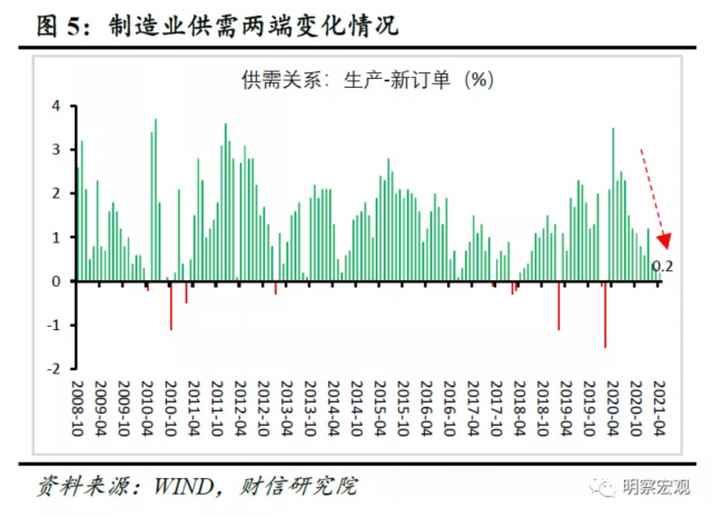 从供需指标看,供需两端同步性增强。4月份制造业供需指标回升幅度相当,制造业“生产和新订单指数差”较上月回落0.1个百分点至0.2%,继续位于历史低位区间(见图5),表明制造业供需互动改善格局延续。往后看,随着国内经济修复面的持续扩展,制造业供需同步波动格局或将进一步增强。