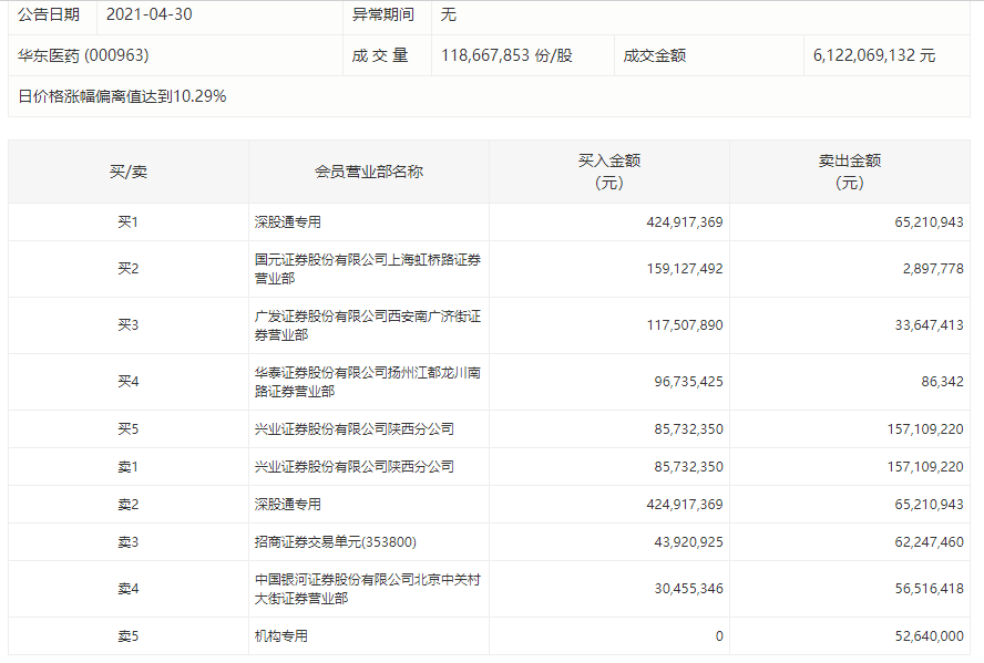 个股方面,盘后数据显示,深股通大幅买入华东医药4.25亿元并卖出6521万元,一机构卖出5264万元。此外,国元证券一营业部买入1.6亿元并卖出290万元。