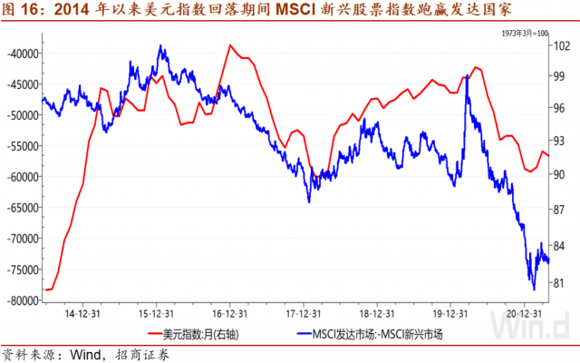 聚焦股票市场,2014年以来,美元指数回落期间,MSCI新兴股票指数跑赢发达国家。如果综合考虑美债和中国国债收益率水平的抬升,大宗商品价格的上涨,我认为股票市场风格将继续向顺周期板块和低估值的价值板块转换。
