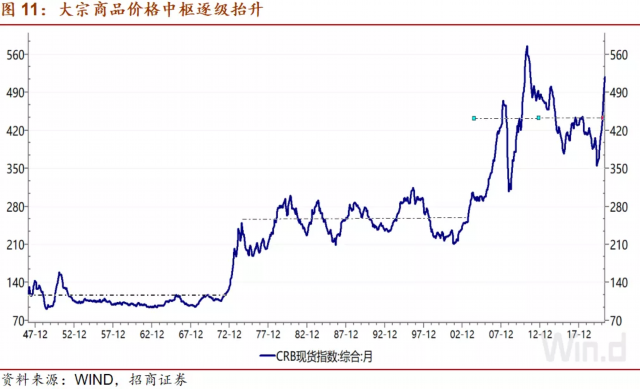 一定程度上说,是中国制造的崛起遇到了2002年至2007年那一轮全球信用的扩张周期。自此之后,中国崛起的影响就一直存在(上图),是CRB现货综合指数从80-90年代平均250的水平,上升到00-10年代平均450水平的主要原因。