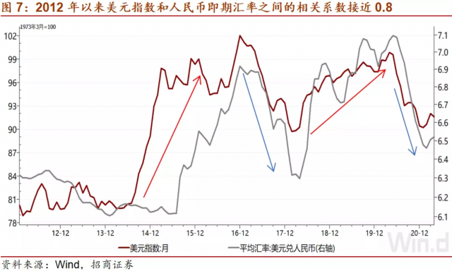 决胜点之五:人民币汇率是否进入升值周期。一如既往,目前关于人民币未来走势的看法可谓众说纷纭。我在2020年9月20日的报告《人民币进入升值周期》中指出,从2012年以来,美元指数和人民币兑美元即期汇率之间的相关系数近0.8(下图)。