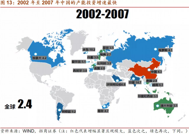 上图可见,1975年至1979年,1986年至1989年,2002年至2007年,历次美元显著回落阶段,全球资本形成均会出现明显扩张。其中,2002年至2007年(图13),产能投资扩张最为显著的是崛起的“世界工厂”—中国,但同时加拿大、俄罗斯、阿根廷、沙特、南非和澳大利亚等大宗商品生产国的投资增速同样迅猛。