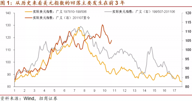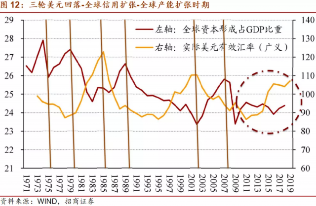 有观点反驳说,2002年至2011年上一轮大宗商品牛市主要是中国房地产投资和基建投资需求所致,这仍然是传统的经济周期分析视角。如果从全球金融周期来看(下图),每一次美元回落所显示的全球信用扩张,都需要全球大宗商品生产领域和全球制造中心显著扩大产能以满足不断增长的需求。