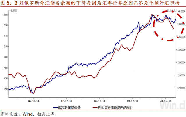 下图可见,2021年3月,俄罗斯外汇储备余额的下降与日本外汇储备余额的下降同时出现,主因是汇率折算因素,并非不得不干预外汇市场,稳定汇率,防止国际资本外流所致。事实上,近期同为大宗商品国的挪威和加拿大央行表态要提前进入货币政策边际收紧状态,从一个侧面已证明俄罗斯和巴西等新兴经济体随商品价格改善的经济基本面和国际资本流动形势。