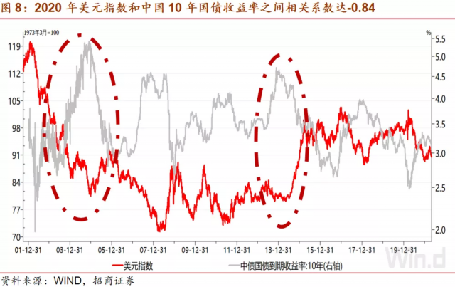 早在2020年6月16日《新冠、美元和大类资产走势》中,我即提出美元指数持续回落的过程中,“看空中国债券价格”。时隔近1年,近期已有个别研究报告开始研究此关系。事实上,从全球金融周期和信用周期的视角看,美元走弱表明全球范围内信用扩张,扩张的信用不会只停留在账面,而是要在全球范围内带来更多的需求和更高的价格水平,对中国这个“世界工厂”和全球主要制造中心来说,就意味着改善的外需,更高的名义GDP水平(上文决胜点4已分析)和更高的10年国债利率水平。
