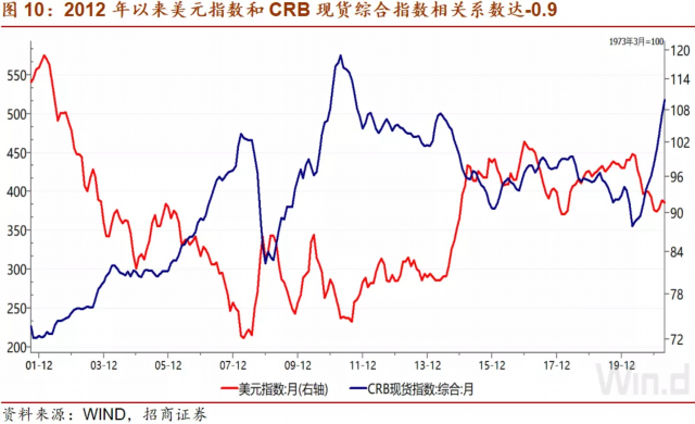 决胜点之七:9年大宗商品牛市是否确立。我在2020年12月11日报告《与周期做朋友》中提出,“2020年将是新一轮大宗商品9年上行周期的起点”。美元指数与大宗商品价格(以CRB现货综指为代表)存在跷跷板效应,2012年以来,两者之间的相关系数为-0.9。
