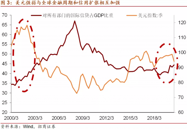 同样的情形,我们看到上一轮全球信用扩张开始于2000年的下半年,滞后到2001年末至2002年初,美元指数出现持续回落,在此过程中,全球金融周期和信用扩张与弱美元之间形成明显的正反馈关系:美元走弱,鼓励更多经济主体借入美元作为债务,扩张信用;美元信用扩张越快,美元相对于欧元和日元的供应越是充足,越是推动美元指数的进一步回落。正如霍华德·马克斯所言:“在周期存续期发生的这些事件,不应该只被看作一个事件接着一个事件地发生,而应该被看作一个事件引发下一个事件,因果关系远远重于先后顺序”。