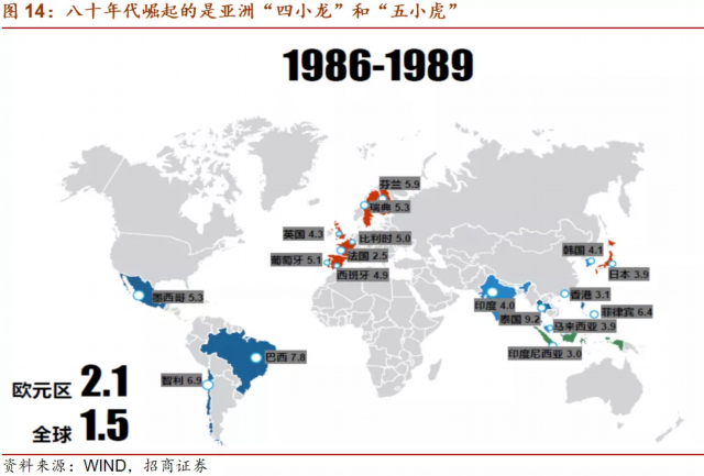 如果再将观察时间前移,1986年至1989年,全球投资增速最快的经济体包括这一时期兴起的世界制造中心—西欧、日本、亚洲“四小龙”和亚洲“五小虎”,同时也包括作为大宗商品生产国的巴西、智利、墨西哥等。