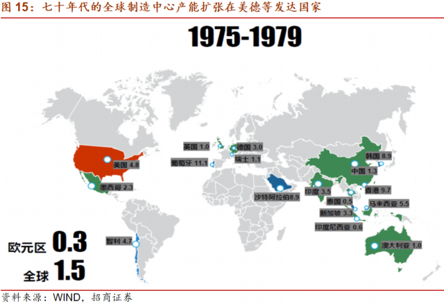 1970年代后期,全球的制造中心产能扩张在美国和德国,同时亚洲的香港、韩国、新加坡、马来西亚、印尼和泰国的产能也在扩张。同样,大宗商品国不会缺席,表现比较突出的包括:澳大利亚、沙特、墨西哥和智利等。