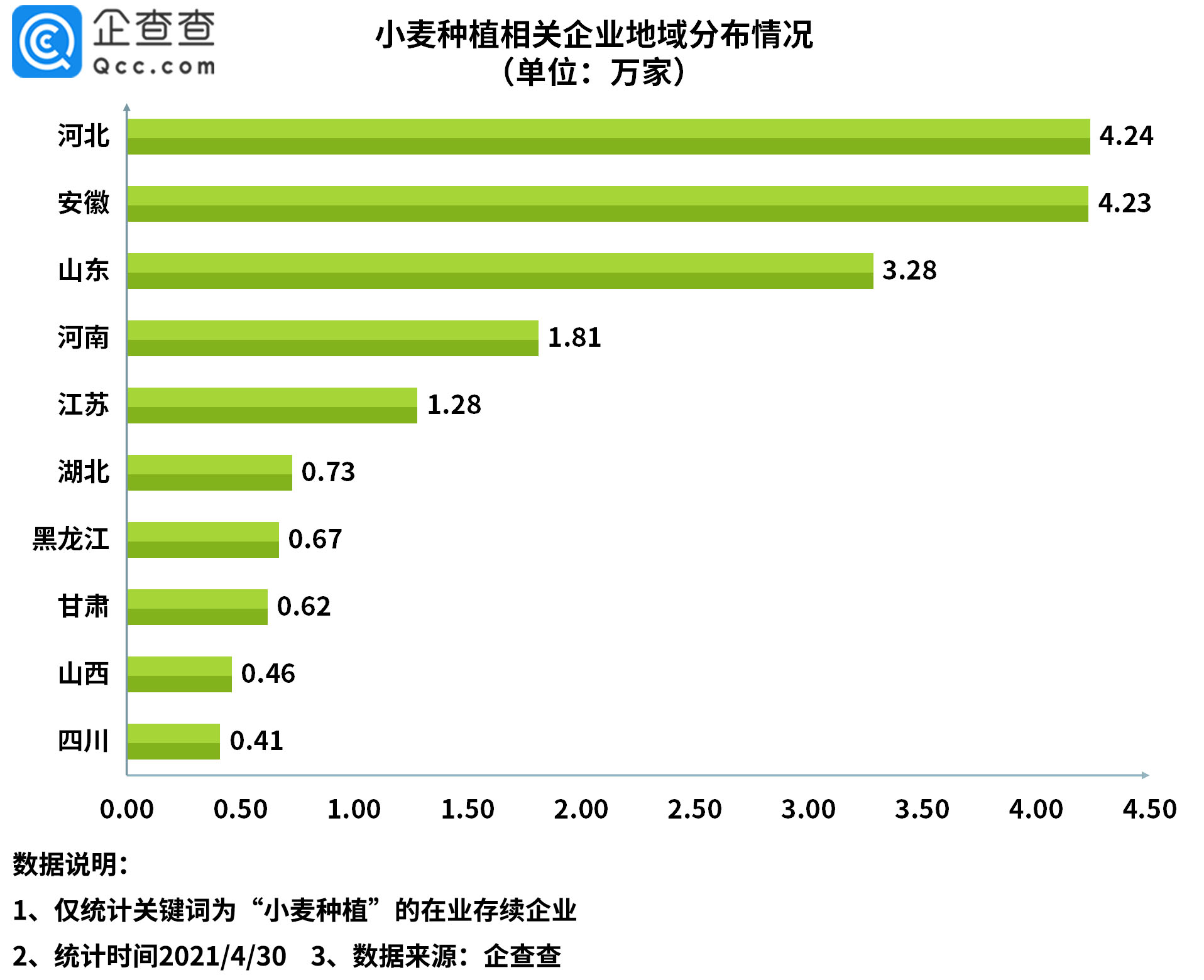 地域上,河北省拥有的小麦种植相关企业的数量最多,达4.24万家,安徽省紧随其后,共有4.23万家,山东、河南与江苏分别以3.28万家、1.81万家和1.28万家排名三至五位。