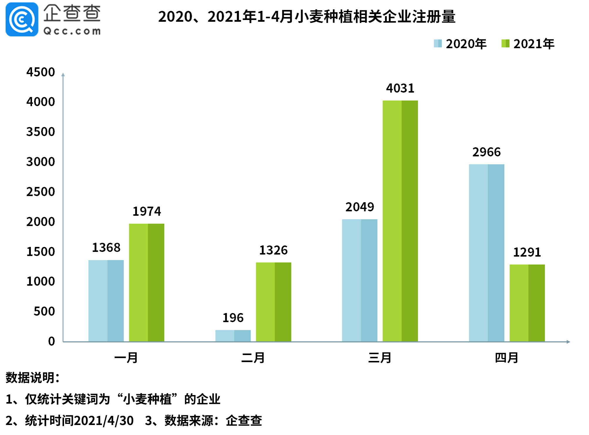 2021年前4个月共新增8622家小麦种植相关企业,同比增长31%。其中,1月份注册量为1974家,同比增长44%,2、3月份注册量分别为1326家、4031家,均呈同比增长趋势,4月份注册量降至1291家,同比下降68%。