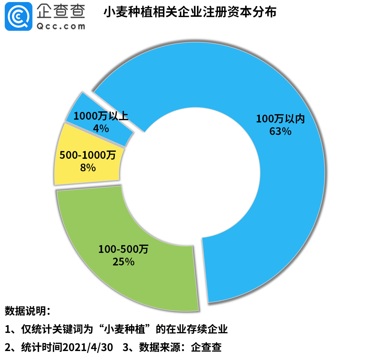 从注册资本来看,我国近9成的小麦种植相关企业注册资本在500万以内,其中注册资本在100万以内的占63%,25%的相关企业注册资本在100-500万之间,而注册资本在1000万以上的企业占比4%。