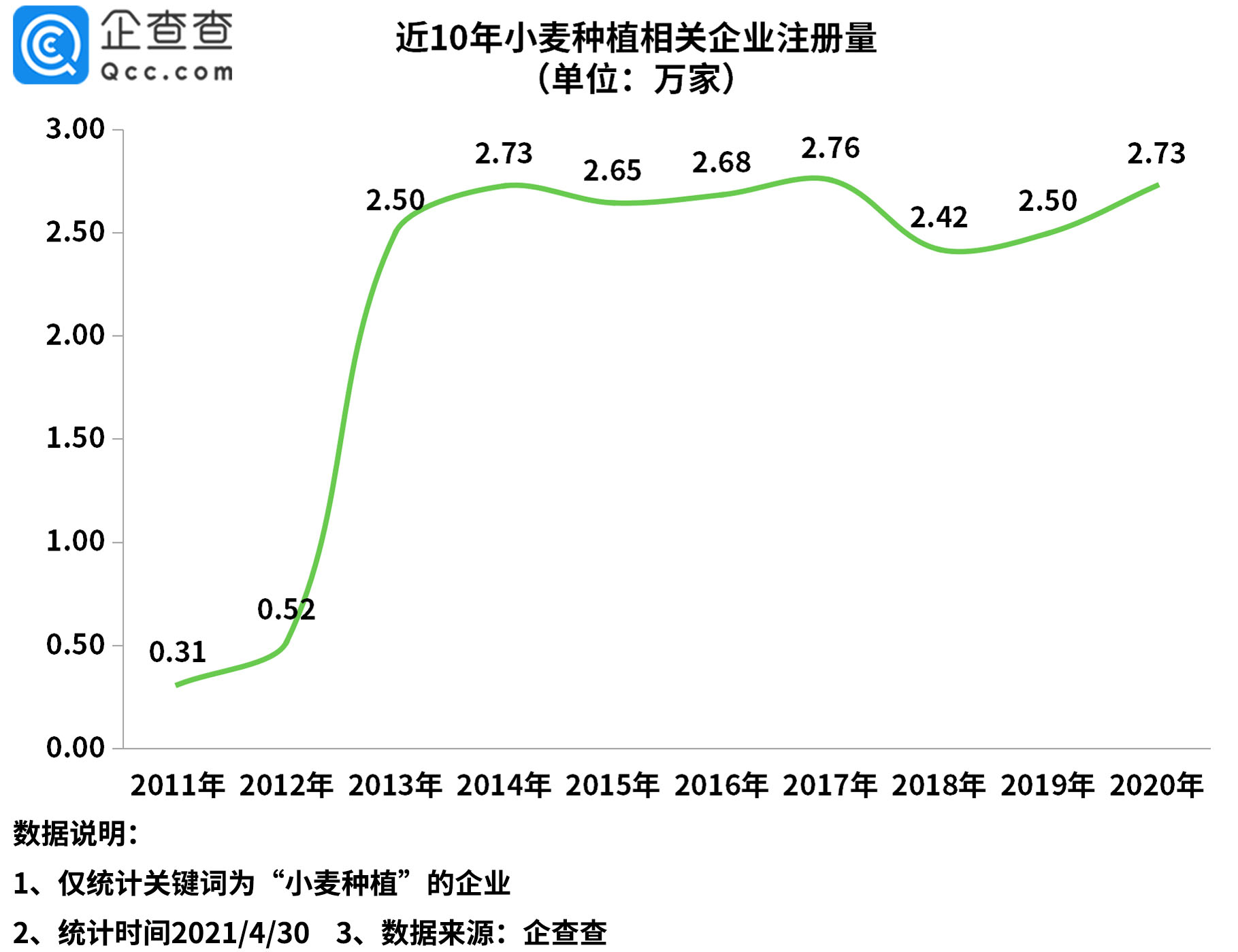 企查查数据显示,近10年我国小麦种植相关企业注册量总体呈波动上涨趋势。随着全国农业机械化进程的加快,2013年相关企业注册量达到2.5万家,同比增长383%,此后年注册量均在2-3万家之间,其中2020年新注册企业2.73万家,同比增长9%。