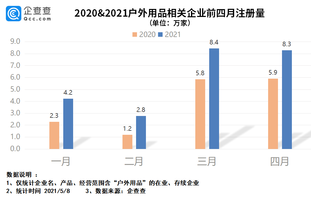 企查查数据显示,2021年前4个月,我国户外用品相关企业注册量为23.7万家,同比增长了55.9%。其中3、4月份注册量分别为8.4万家、8.3万家,均呈同比增长趋势。