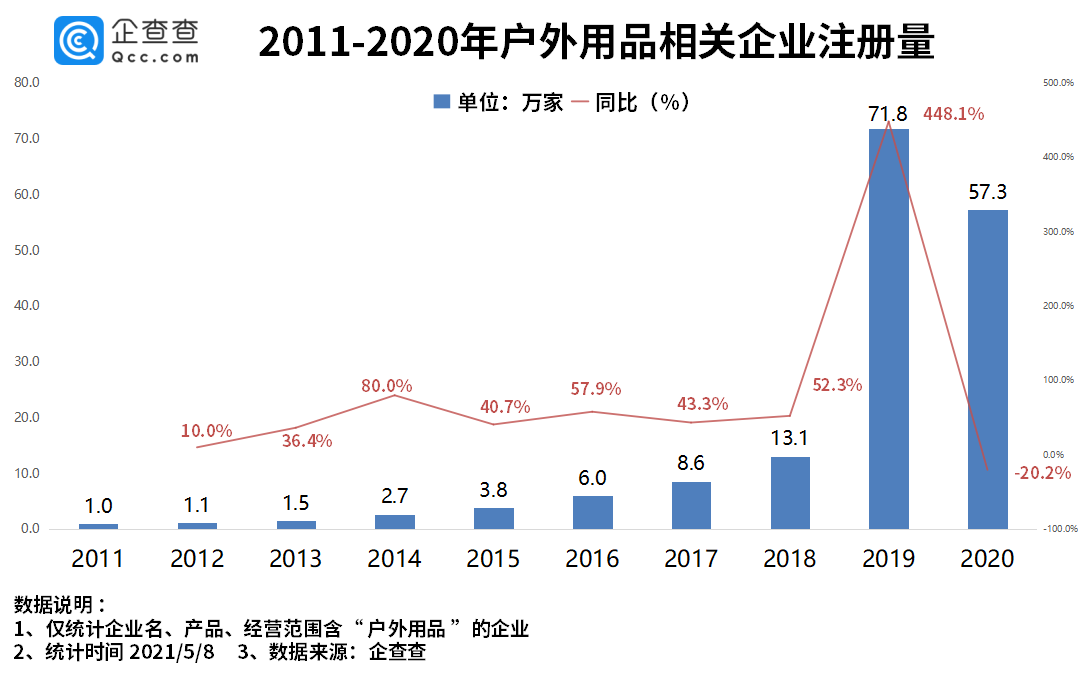 从近十年户外用品相关企业发展状况来看,企查查数据显示,2011-2019年企业注册量逐年增长,其中2019年迎来爆发期,全年注册量达到71.8万家,同比增长448.1%,2020年注册量为57.3万家,同比下降20.2%。