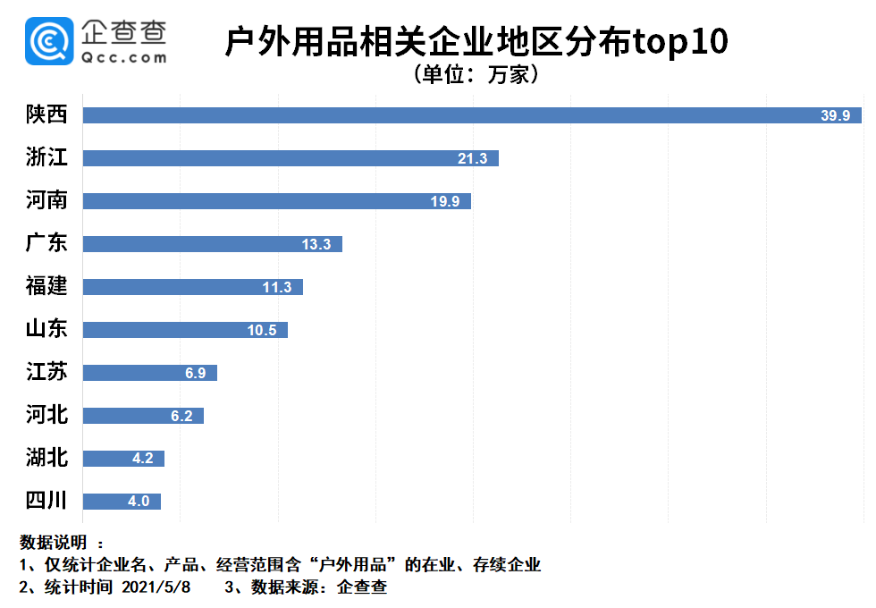 从地域分布来看,企查查数据显示,目前我国在业、存续的户外用品相关企业主要分布在陕西、浙江、河南等省份。其中陕西省以39.9万家排名第一,浙江、河南分别以21.3万家、19.9万家位列二三名。此外,广东、福建、山东的企业数量也超过了10万家。