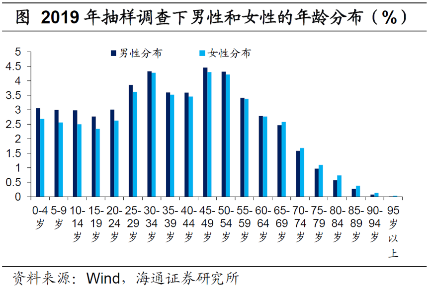 但由于男性预期寿命要短于女性,总人口性别比的改善,或更多反映的是整体老龄化趋势的加深。结构上的性别比例失衡问题依然较为严重。根据2019年抽样调查显示,20岁以下的男性占总人口比重为11.8%,女性占比为10.1%,两者相差了1.7个百分点,这意味着未来适婚年龄的男性相比于女性要多2400万人左右。同时,20-49岁之间的男性和女性占比分别为22.9%和21.8%,两者之差也达到1.1%。也就是说49岁以下的男性和女性占比之差达到2.8个百分点,高于2019年抽样调查的整体人口中男性和女性占比之差的2.2个百分点。