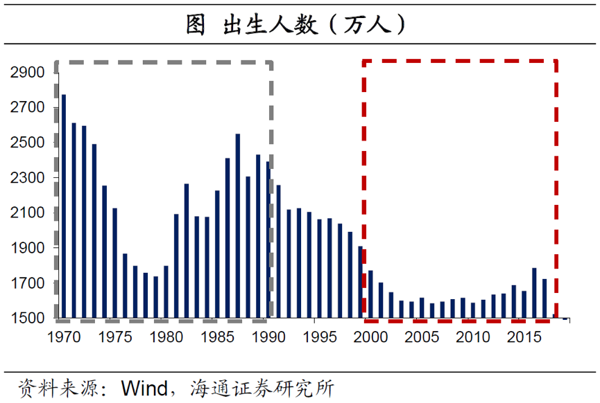更值得重视的是,未来适龄生育女性占比还面临下滑。由于计划生育的严格执行,1991年开始我国出生人数出现大幅下跌,1998年以后年出生人数已经跌破2000万人。未来20年随着2000年以后出生的女性逐步步入生育年龄以及70年代-90年代出生的女性逐步退出适龄生育范围,我国适龄生育女性占比将面临大幅下滑。由于适龄生育女性的年龄在20岁以后,因此未来20年适龄女性占比的下降是既成事实。