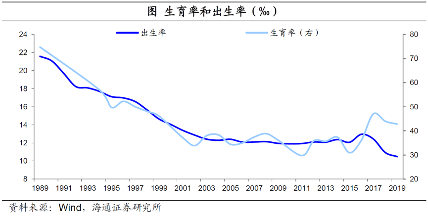 而二胎放开以后生育率也出现再次回落。尽管2020年全国0—14岁人口占比为18.0%,相比于2010年人口普查的16.6%上升1.4个百分点,但这与15年全面放开二孩政策带来的二孩生育率短期回升相关。根据2019年的抽样调查数据显示,一孩生育率一直处于下降趋势,而二孩生育率在短期回升后也开始回落。