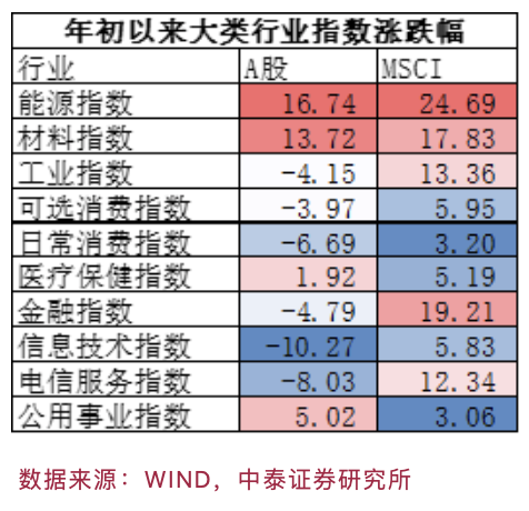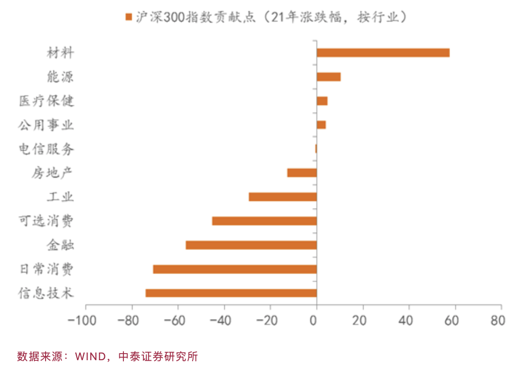 年初以来大类行业表现来看,无论是A股还是全球,都是能源和材料板块领涨,但A股涨幅比MSCI全球指数要弱一些。另一个主要的落差在金融指数,全球金融指数都暴涨,唯独A股是下跌的,这还是建立在A股银行指数今年有9%以上的涨幅基础上,显然,拖后腿的是券商和保险。此外,消费和信息技术因为去年抱团太猛,今年回调幅度较大,我们的工业指数军工权重较高,所以也表现不好,这几个板块是今年沪深300指数点位变化的贡献度里最靠后的。