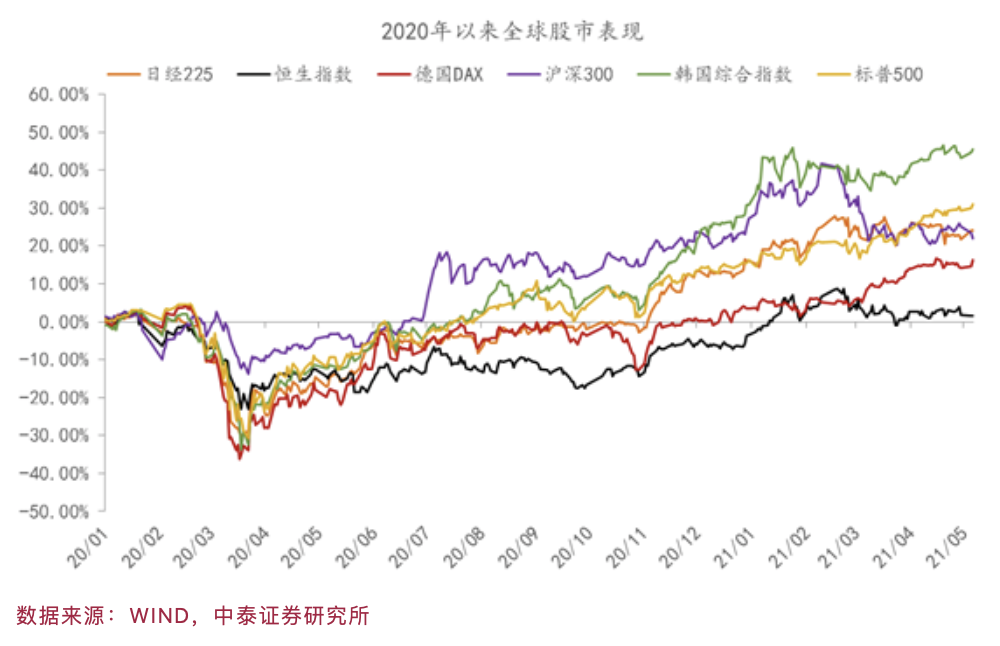 王仕进认为最近的全球股市出现过两次背离,一次是2018年,特朗普破坏了传统意义上的跨境贸易流动逻辑,导致美股一枝独秀。再一次就是现在,2月底以来,A股和港股明显弱于其他市场,去年中韩两国因为疫情控制得好,充分受益这波供需缺口,两国股市也领跑全球。但是今年以来,韩国股市继续受益出口驱动,而A股则显得有点乏力。