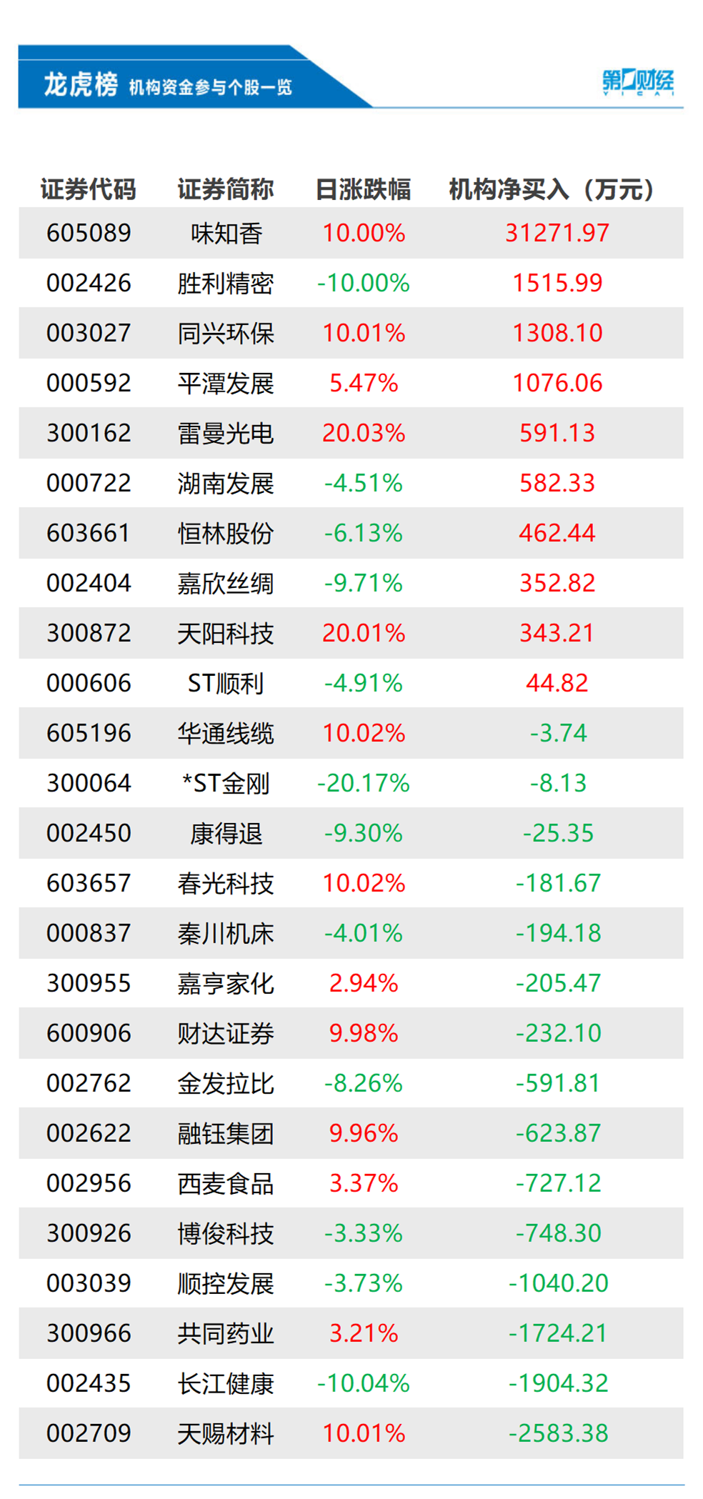 当天机构净买入前三的股票分别是味知香、胜利精密、同兴环保,净买入金额分别是3.13亿元、1516万元、1308万元。