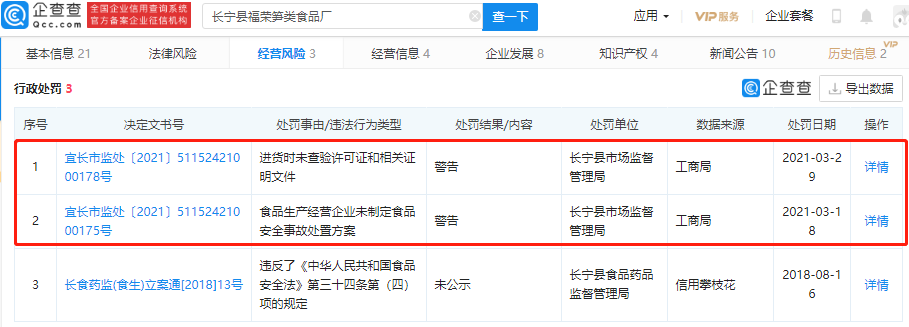 企查查风险信息显示,今年3月,该公司曾因“食品生产经营企业未制定食品安全事故处置方案”、“进货时未查验许可证和相关证明文件”被行政处罚。