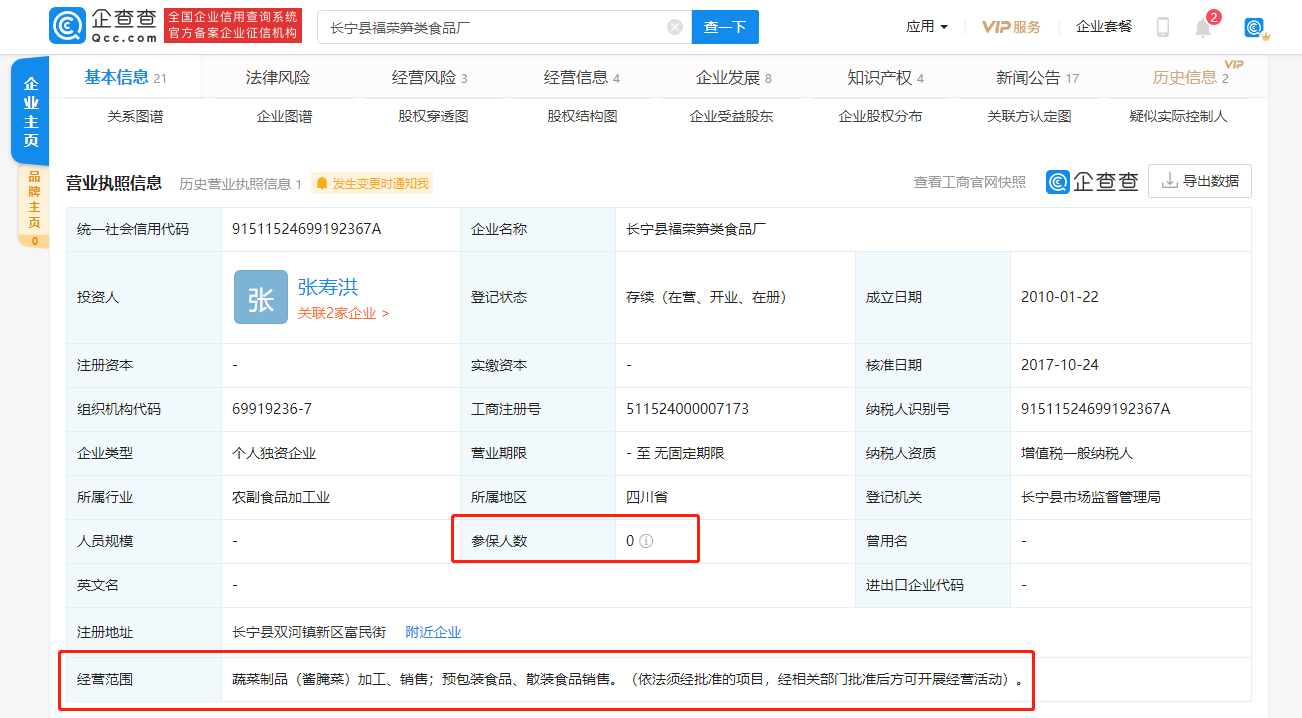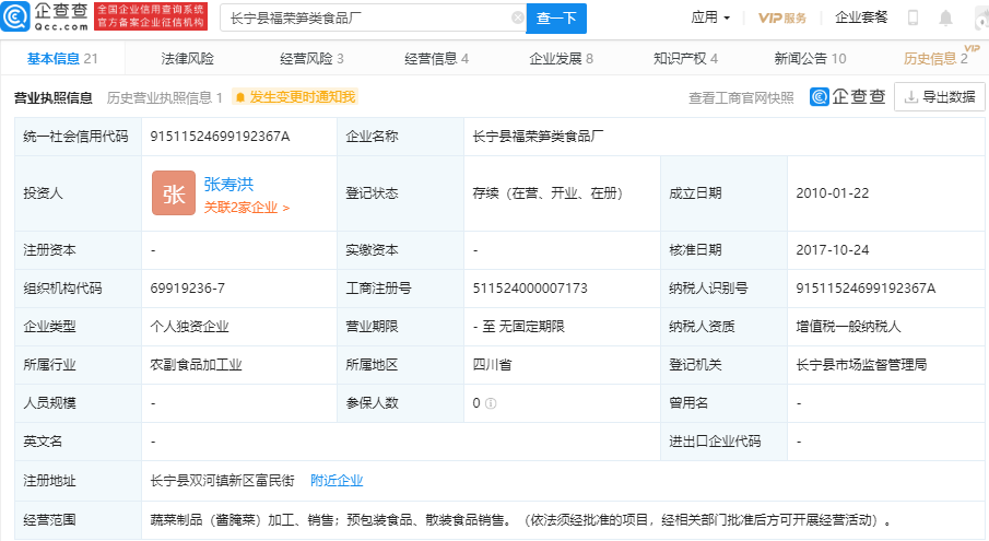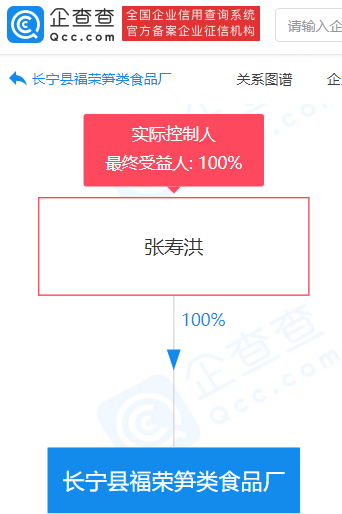 企查查显示,长宁县福荣笋类食品厂成立于2010年,投资人为张寿洪,经营范围包含:蔬菜制品(酱腌菜)加工、销售;预包装食品、散装食品销售,其唯一股东、实际控制人、最终受益人为张寿洪。
