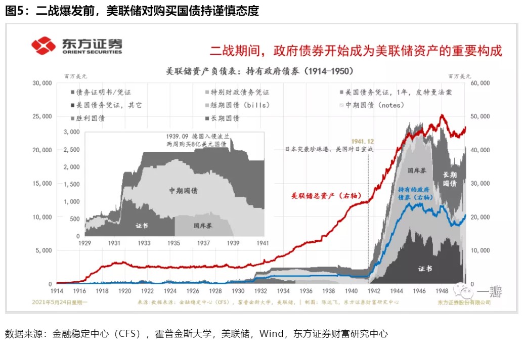 从1932年至二战爆发,美联储在公开市场买入国债方面一直非常谨慎(图5)。当时,美联储内外盛行的观点是:“在使货币进入流通领域的方法中,有两种本质不同的方法:购买政府债券与购买票据……通过购买票据投放的货币主要是为了帮助真正意义上的商业交易,而对于通过购买政府债券投放的货币,没有人能够弄清它可能的去向,例如,借给了华尔街。”故以国债为基础投放基础货币被认为违反了真实票据原则,可能刺激金融泡沫,大萧条之前的股票泡沫之过本就被计在了美联储身上。